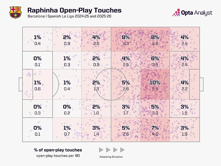 Рафинья поддерживал свою впечатляющую результативность прошлого сезона (3 гола и 2 голевые передачи в 384 минутах в Ла Лиге до травмы), но, возможно, он был и важнейшим элементом прессинга «Барселоны» в сезоне 2024/25. Он чувствовал, когда нужно вступать в отбор, а когда оставаться на месте.