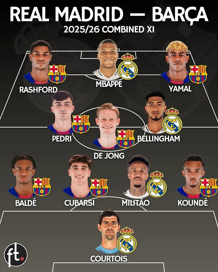 В команде больше представителей «блауграны»: Маркус Рэшфорд, Ламин Ямаль, Педри, Френки де Йонг, Алехандро Бальде, Пау Кубарси и Жюль Кунде. За «королевский клуб» отвечают четверо: Килиан Мбаппе, Джуд Беллингем, Эдер Милитао и Тибо Куртуа.