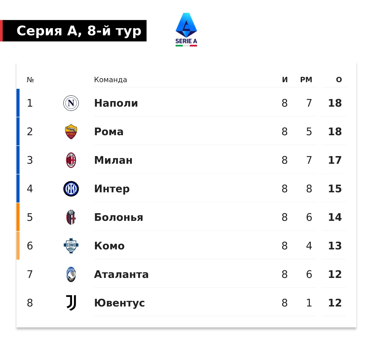 Дальше – стоп: не обыграли «Верону» (1:1), спаслись от поражения от «Аталанты» только в конце (1:1), не забили «Милану» (0:0), проиграли «Комо» (0:2). Проигрыш «Лацио» – пятый матч подряд без побед в чемпионате, за это время набрали всего три очка и забили два мяча. Как результат – восьмое место и всего девять забитых за восемь игр.