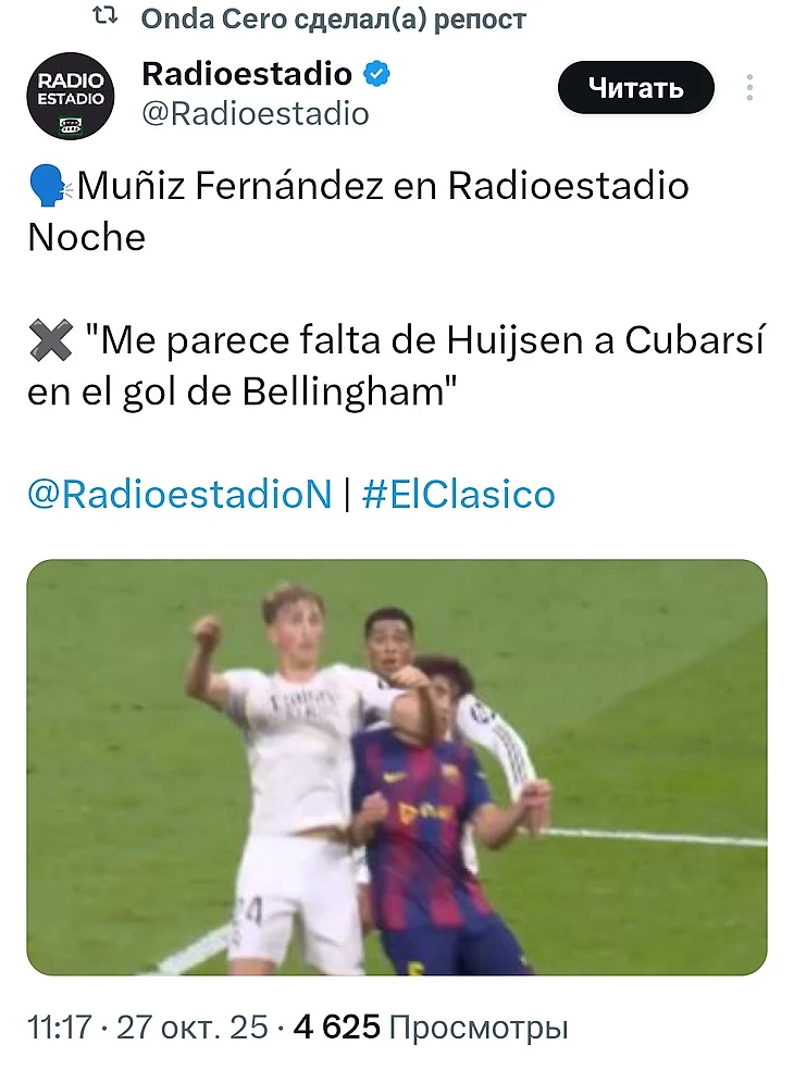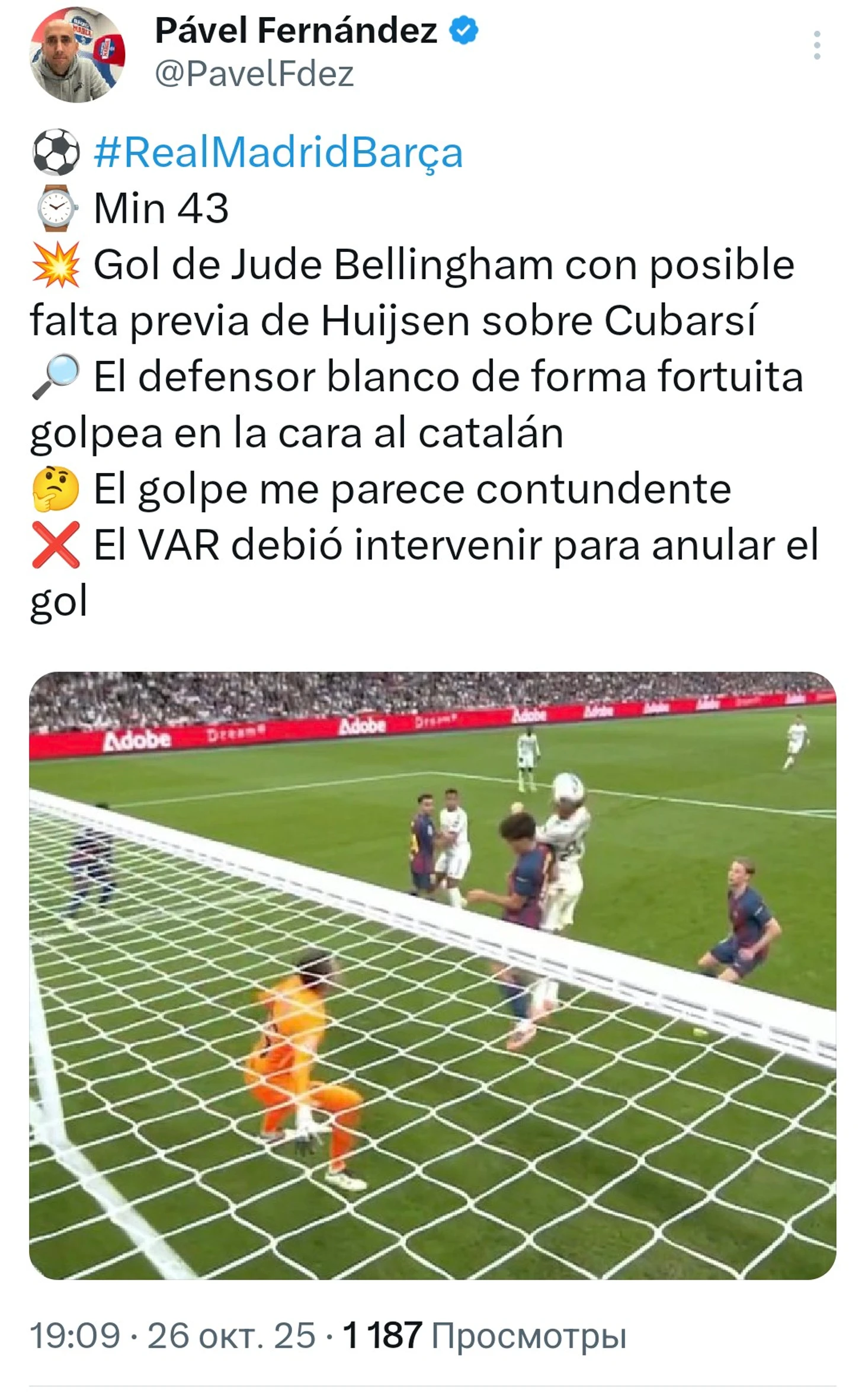 Павел Фернандес, бывший рефери, высказался о эпизодах с участием игроков Хейсена и Кубарси. После просмотра инцидента, произошедшего перед голом Джуда Беллингема, Фернандес выразил мнение, что защитник «Реала» Дин Хейсен совершил нарушение правил, ударив локтем в шею Пау Кубарси. Гол был засчитан главным судьей Сесаром Сото Градо, однако Фернандес считает, что VAR следовало вмешаться и отменить взятие ворот, поскольку удар выглядел достаточно серьезным.