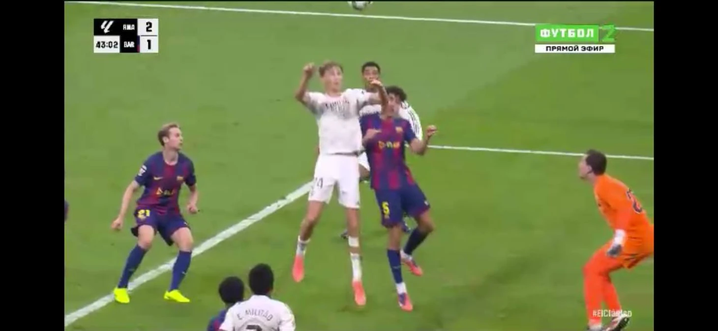 Третья спорная ситуация возникла непосредственно перед перерывом, когда был забит решающий гол Беллингема, установивший счёт 2:1. Кубарси двигался, чтобы перехватить передачу Милитао, но не смог сделать это, получив удар локтем в лицо от Хёйсена. На прошлой неделе сам Кубарси видел, как его гол против Жироны был аннулирован из-за предшествующего удара локтем Эрика Гарсии, однако обратная ситуация не имела места в Сантьяго Бернабеу. «Обворовывают».