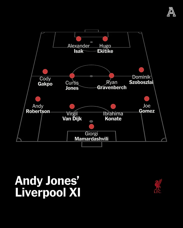 Это оставило бы три места в атаке между Коди Гакпо, Александром Исаком, Юго Экитике, Мохамедом Салахом, Флорианом Вирцем и Федерико Кьезой.