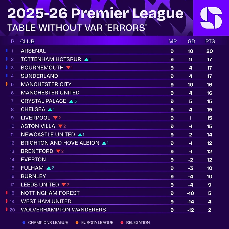 Портал Squawka, специализирующийся на футбольной аналитике и статистике, предположил, как бы выглядела турнирная таблица АПЛ после девяти туров нового сезона, если бы VAR не допустил ни одной ошибки.