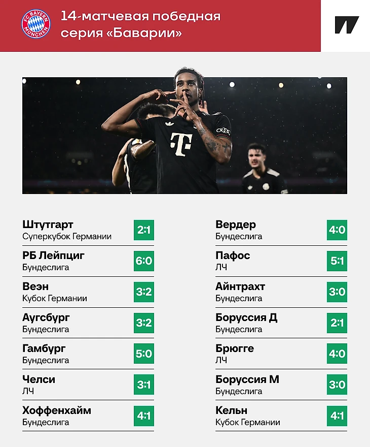 Это уже 14-я победа «Баварии» в 14 матчах сезона. В последний раз так мощно в топ-лигах стартовал «Милан» – аж в сезоне-1992/93, когда одержал 13 побед.