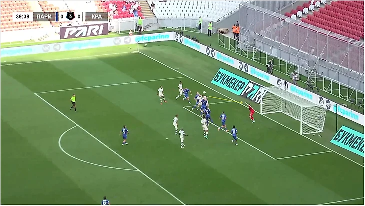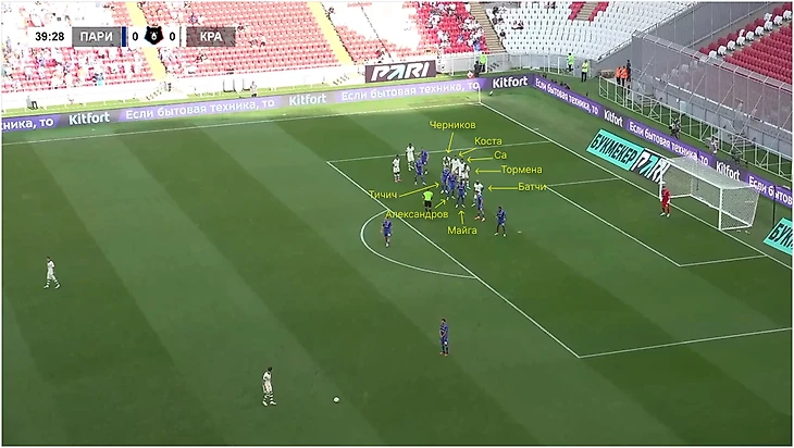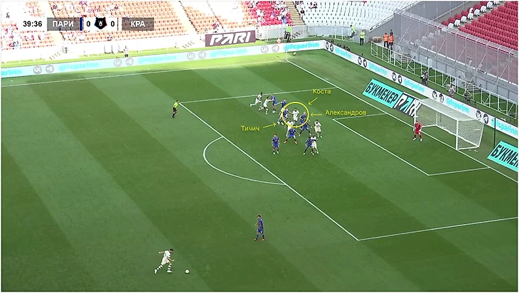 Против «Пари НН» «Краснодар» даже не использовал блоки: Са, Тормена и Батчи побежали на ближнюю, а Диего Коста открылся в зону между Виктором Александровым и Лукой Вешнером Тичичем.