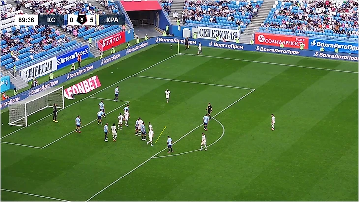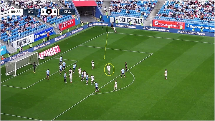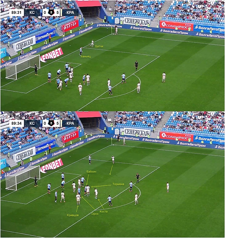 Гол «Крыльям» – другая история. Во-первых, Кривцов находился в штрафной за группой игроков: Доминик Ороз играл по Косте, Сергей Бабкин – по Тормене. Во-вторых, в самом начале Батчи открывался под Сперцяна для короткого розыгрыша. Эдуард проигнорировал, Батчи пришлось возвращаться в штрафную, но заодно удалось вытянуть Михайло Баньяца.