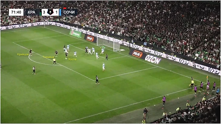 В момент подачи Коста и Тормена двигались из штрафной и оставляли мяч Кривцову под удар.