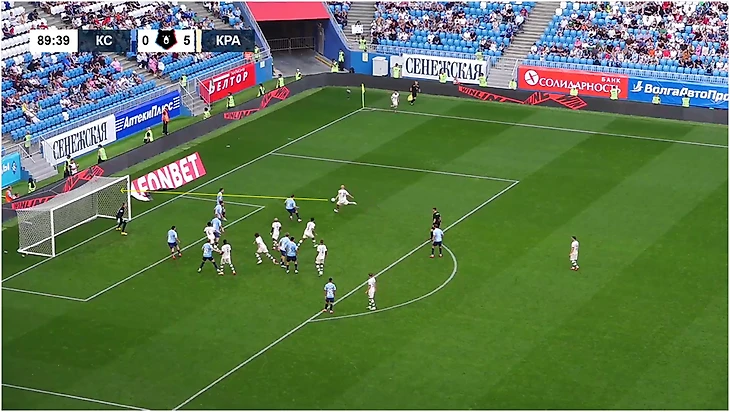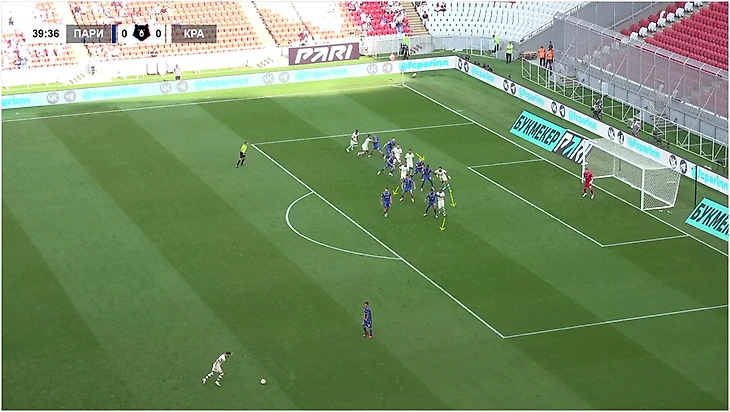На деле предмет спора выглядит так. «Краснодар» использует блок игроков за линией офсайда перед подачей. Дальше идут открывания из-за спины в зоны между игроками соперника.
