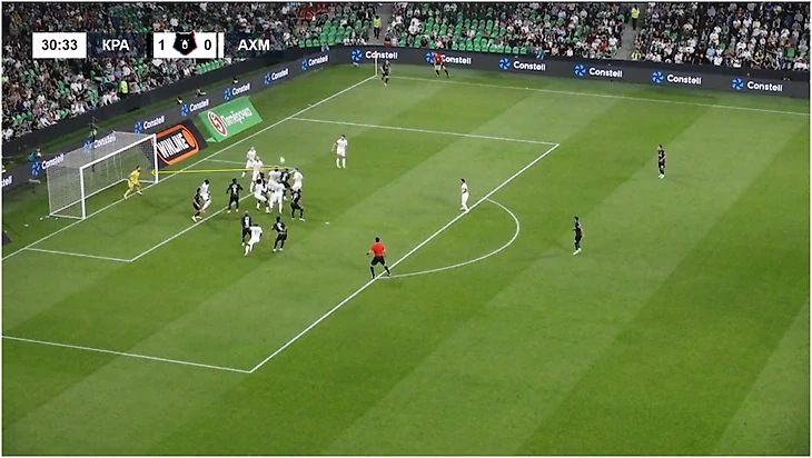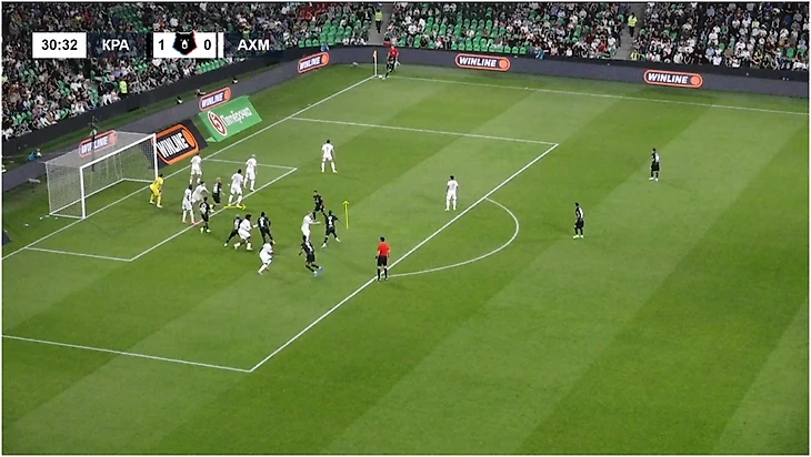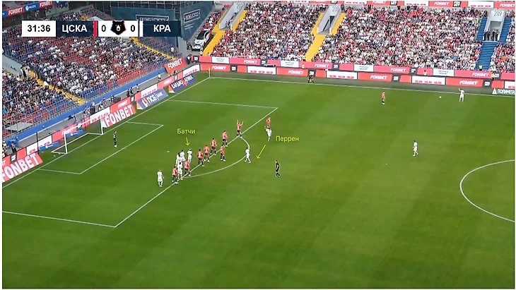 Еще одна интересная деталь – движение Перрена: изначально открывался под короткий розыгрыш со Сперцяном, но затем отошел к штрафной, забежал по дуге и выскочил на дальнем углу перед Миланом Гайичем. Не сыграло никакой роли, но дало перевес на дальней штанге.