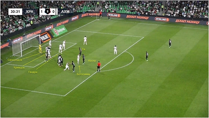 «Краснодар» эффективно пользуется блоками (особенно полезен Виктор Са), благодаря которым создает буферную зону для партнеров. Пример из матча с «Ахматом»: Са заблокировал Богосаваца, который играл по Косте. Дополнительное внимание – к Кривцову: перед подачей располагался в створе, по нему играл Максим Самородов. Дальше полузащитник «Краснодара» рванул на ближнюю и встал перед Надером Гандри – это съело несколько сотых секунд, благодаря которым Коста оказался первым на мяче.