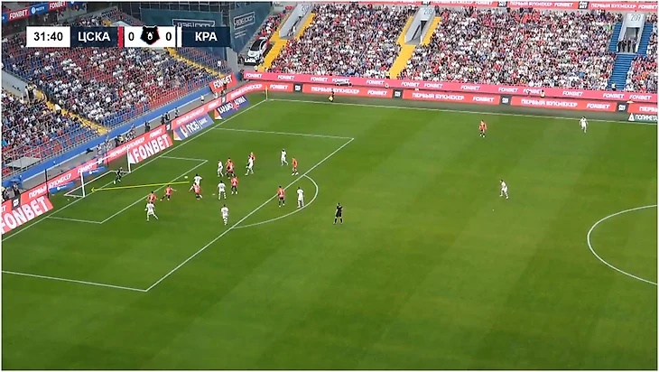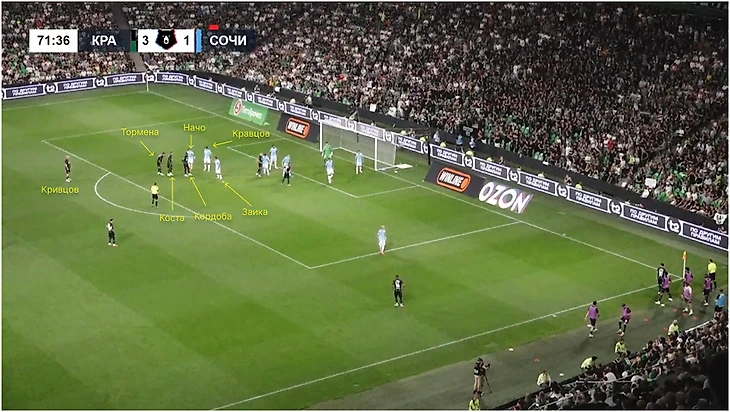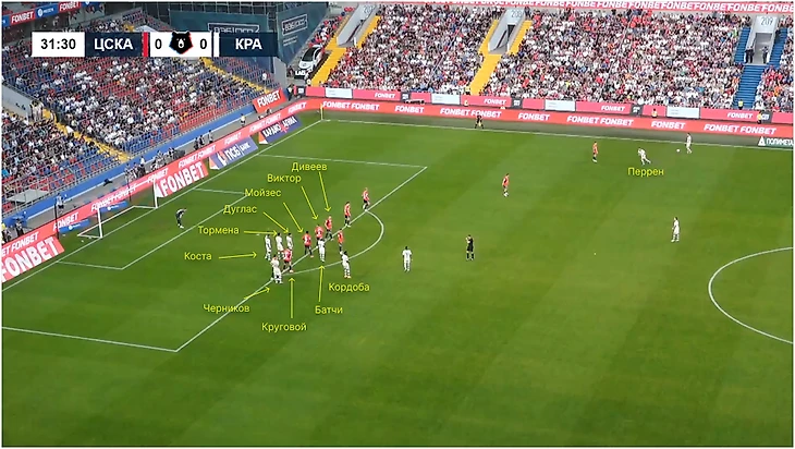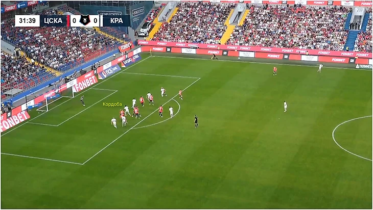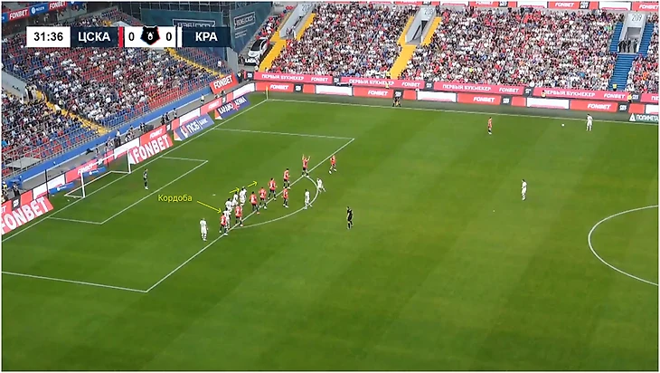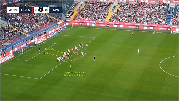 Похожим образом «Краснодар» забил отмененный гол ЦСКА. Блок за спиной соперника из Тормены, Косты, Дугласа Аугусто и пришедшего к ним Жоау Батчи разбегается при подаче. В этот момент стартует Кордоба, которого отпускает Данил Круговой. Колумбийца должен подхватывать Мойзес, но а) ему трудно контролировать Кордобу, потому что тот выбегает из-за спины, б) Дуглас ныряет между ним и Жоау Виктором и блокирует обоих, тем самым создавая пространство для Кордобы.