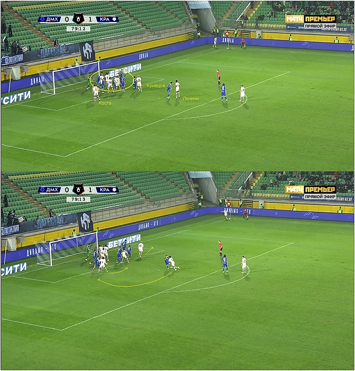 На угловых «Краснодар» также вдохновляется «Арсеналом». Например, против «Махачкалы» основная группа грузила вратарскую, а тройка Кривцов – Ленини – Коста путала движением.