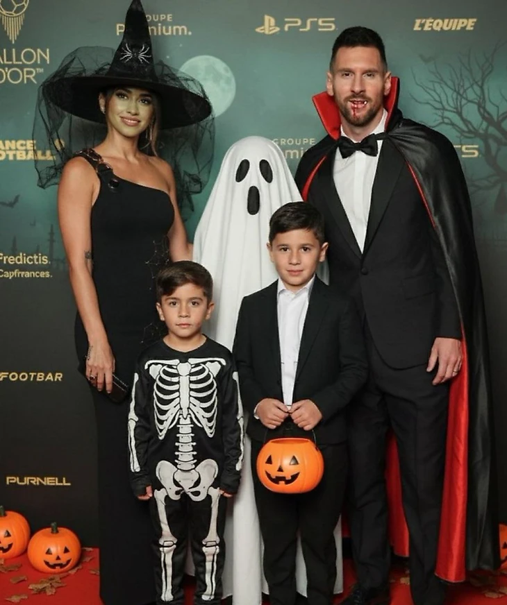 С семьей отпраздновал Лео Месси: сам стал вампиром, вокруг него ведьма, привидение, скелет и сын Матео почему-то без костюма.