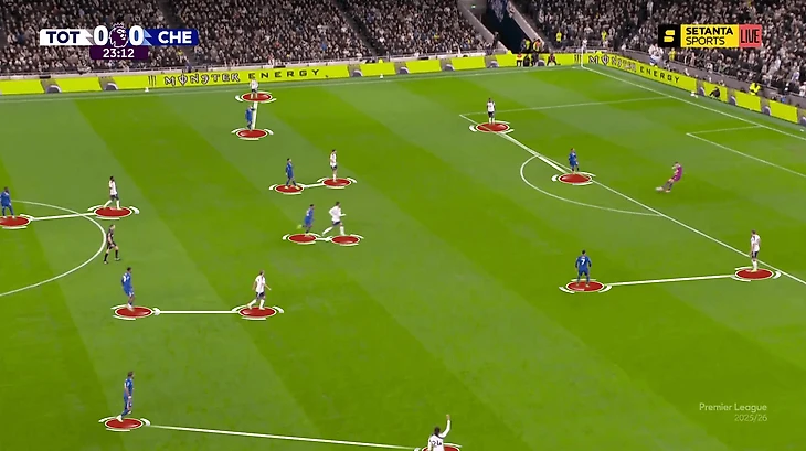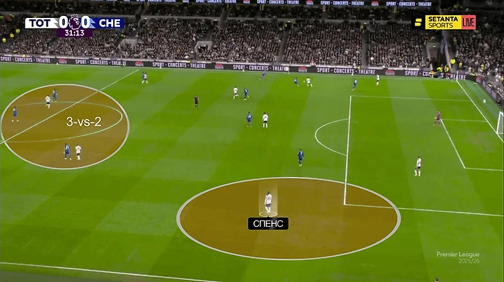 Персоналки по всему полю – основной режим, но у Марески был припасен еще тонкий альтернативный вариант, учитывающий специфику соперника. Часто без опеки оставляли Джеда Спенса – правшу, играющего на левом фланге защиты «шпор», которому нужно больше времени на обработку. Оставляя его, «Челси» получал подстраховку сзади: