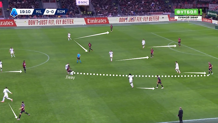 Очень большое значение приобрело движение пары форвардов. Рафаэль Леау и Кристофер Нкунку регулярно опускались ниже и пытались сохранить мяч, но их агрессивно накрывали защитники. Лишь в редких эпизодах получалось выиграть борьбу и продолжить атаку. Здесь Леау все-таки отклеился от Джанлуки Манчини и протащил мяч выше.