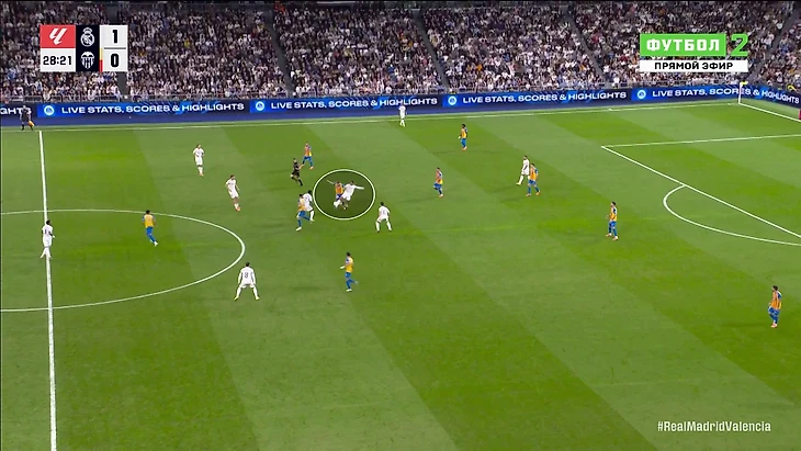 Например, тут Килиан после потери «Реала» оказался слева. «Валенсия» пытается начать быструю атаку:
