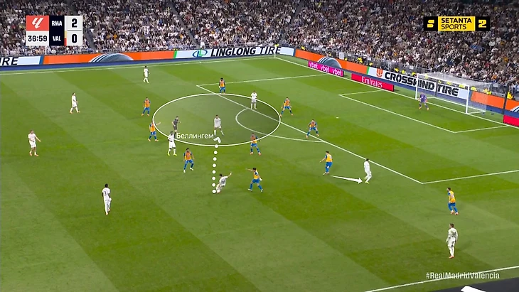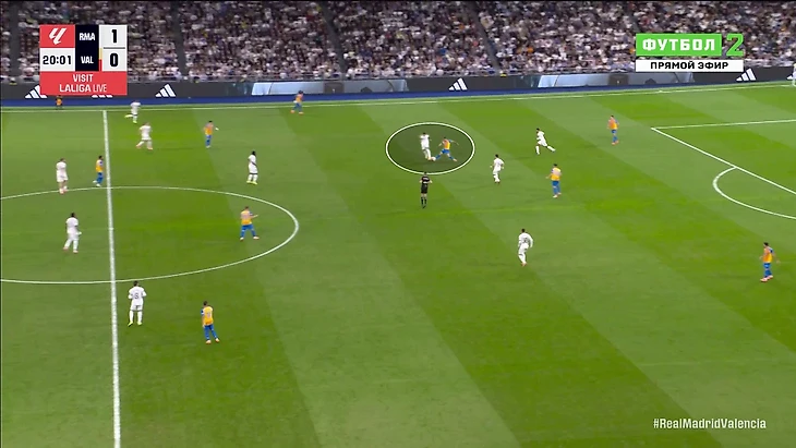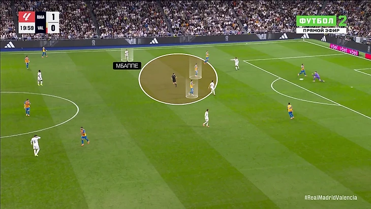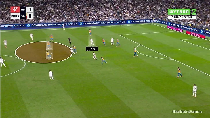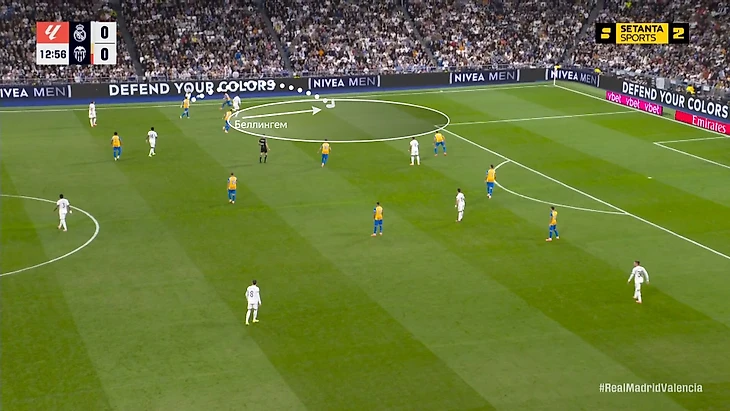 Против «Валенсии» Джуд находил свободу в похожей манере. Иногда это помогало продвигать атаку, а еще позволяло выйти на удар, когда Винисиус или Мбаппе рядом стягивали внимание. В этом эпизоде Пепелу из опорной зоны опустился за Вальверде, а Беллингем благодаря отсутствию плотности в центре чуть не вывел Килиана на удар.