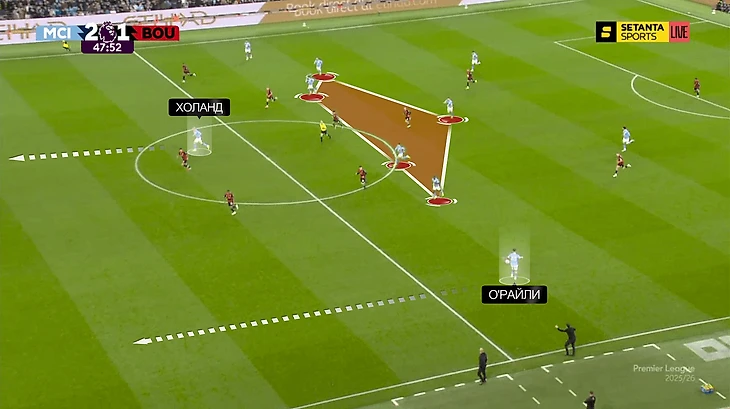 Секрет – структура владения Пепа с пятью технарями в центре поля вместо обычных четырех. Полузащита часто состояла из Нико Гонсалеса, Бернарду Силвы, Фила Фодена и стартовавших номинально на флангах Жереми Доку и Райана Шерки. За рывки против высокой линии отвечали Эрлинг Холанд и левый защитник Нико О’Райли: