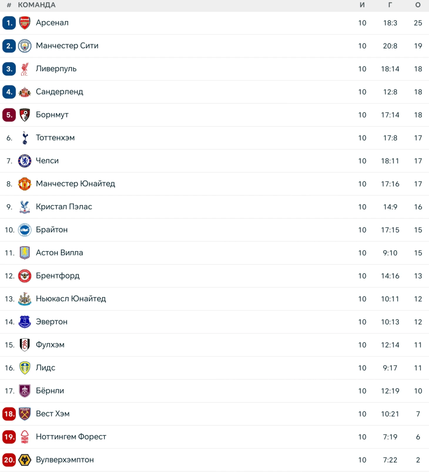 Одна из немногих команд, которые играют стабильно. Они были последними после пяти туров, они остаются последними после десяти туров. Но можем отметить прогресс: после пяти туров было 0 очков, после десяти туров стало 2 очка. Сыграли вничью против «Тоттенхэма» и «Брайтона». Остаётся одна загадка: в каком туре «Вулверхэмптон» одержит первую победу и против кого. По последним новостям, главный тренер Витор Перейра был уволен. Имя нового главного тренера пока не озвучили.