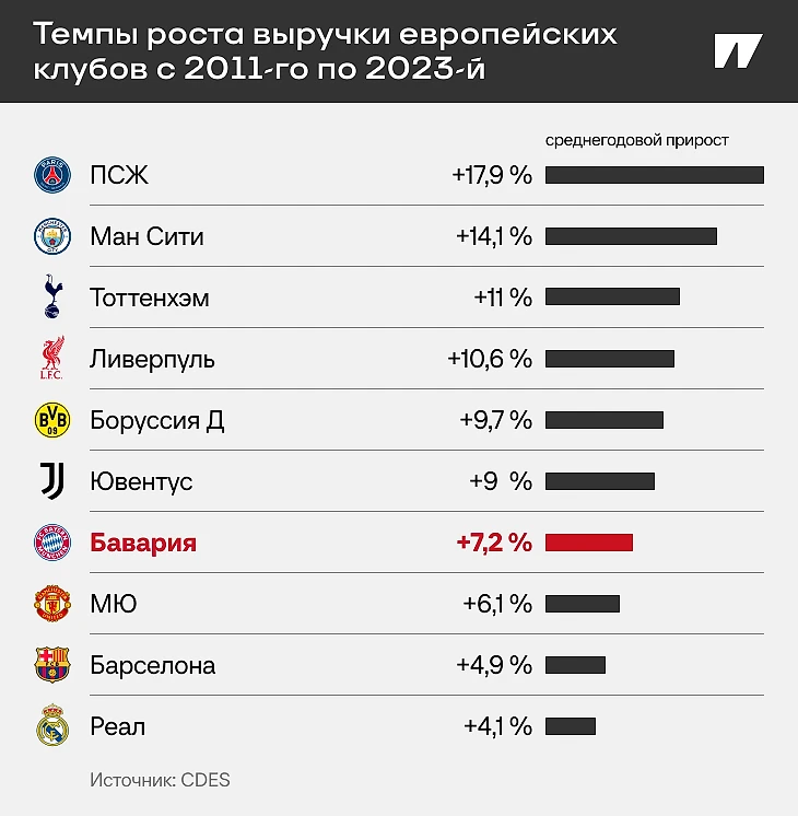 Ежегодный рост выручки «Баварии» не должен удивлять. В ноябре французский Центр спортивного права и экономики (CDES) подсчитал, что с 2011 года (делали по заказу «ПСЖ», поэтому временной отсечкой служит покупка клуба шейхами) «Бавария» седьмая в Европе по темпам роста доходов – 7,2% среднегодового прироста.