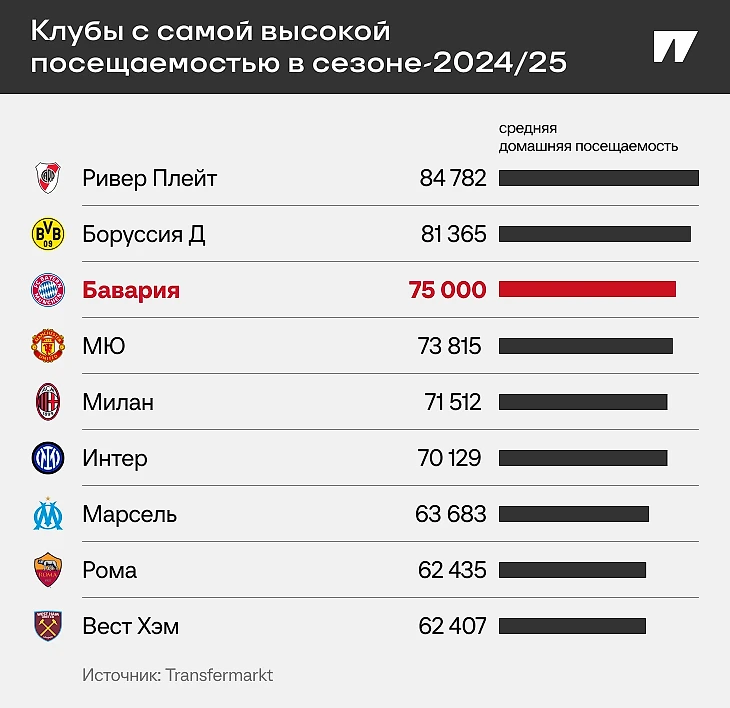 «Бавария» идет третьей в футбольном мире по средней домашней посещаемости – 75 000 зрителей при вместимости «Альянц Арены» в 75 024. Больше только у «Ривер Плейт» и дортмундской «Боруссии».
