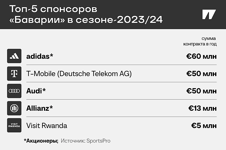 Сейчас в пятерку крупнейших спонсоров «Баварии» входят сразу три основных акционера (у каждого по 8,3% акций): страховая компания Allianz (общие активы оцениваются в 900 млрд евро), автоконцерн Audi (70 млрд) и спортивный гигант adidas (20 млрд евро).