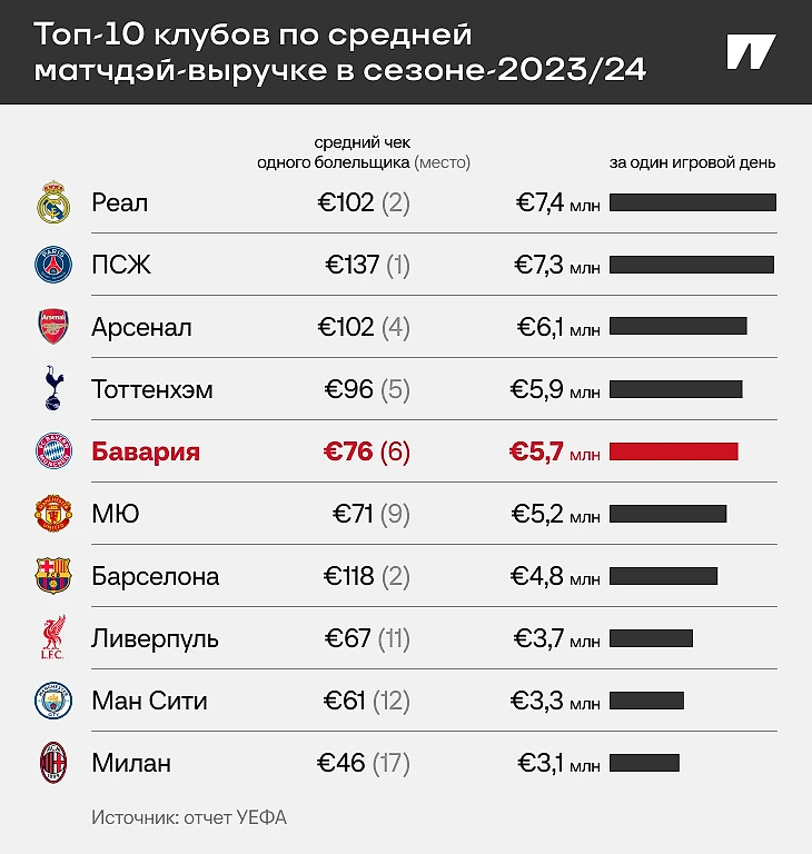 Мюнхенцы высоко по сборам с одного игрового дня (5,7 млн евро) и по среднему чеку от одного болельщика (76 евро). Правда, на играх «ПСЖ» посетитель тратит почти в два раза больше. Цены на матчи «Баварии» остаются сравнительно низкими во многом из-за правила 50+1 (с конца 90-х в футбольной Германии болельщики должны иметь большинство при принятии основных управленческих решений, чтобы избежать захвата власти заграничными инвесторами).