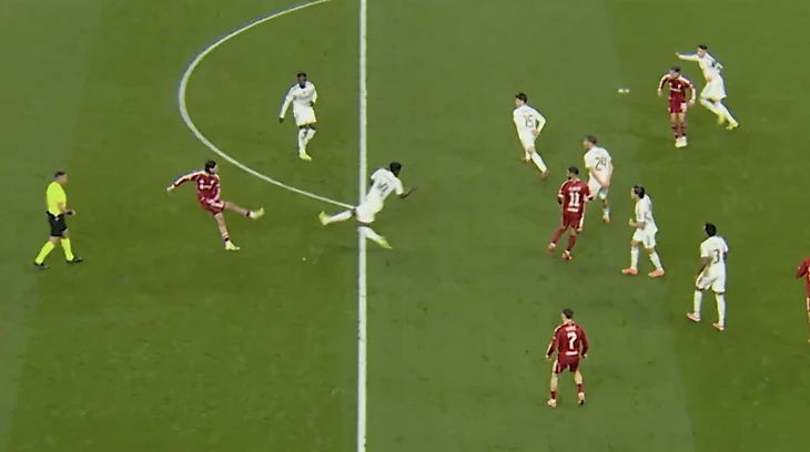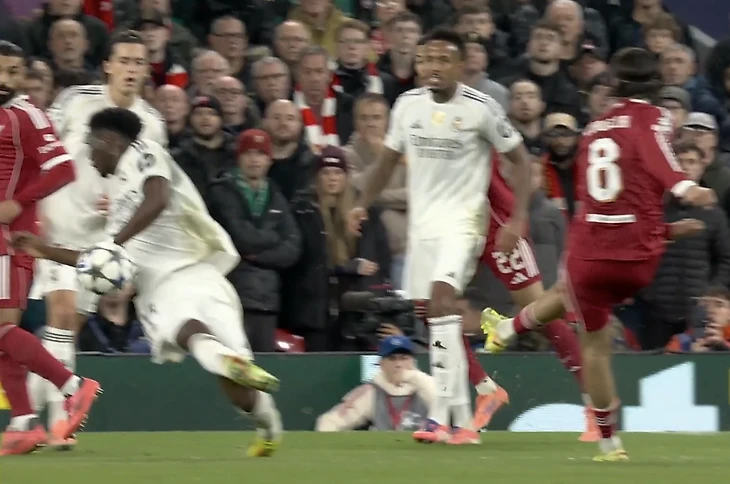 Самый обсуждаемый момент первого тайма в матче «Ливерпуля» и «Реала» – потенциальный пенальти в ворота мадридцев после попадания мяча в руку Орельена Тчуамени.