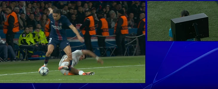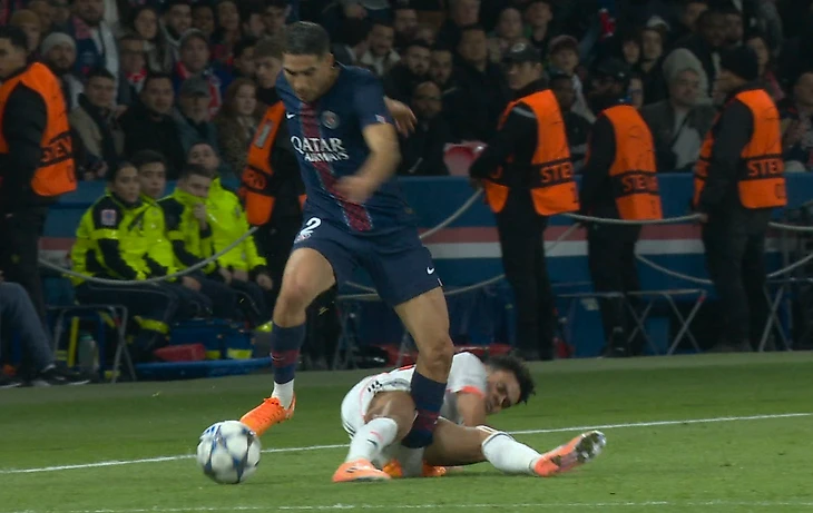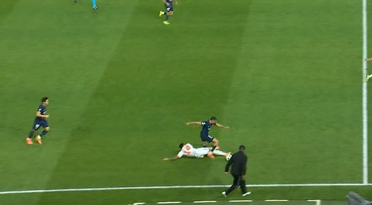 Это было еще на половине «ПСЖ» – и колумбиец бросился в ноги сопернику, причем сзади. Так это выглядело с телекартинки: Венсан Компани, находившийся в метре от эпизода, намекал на симуляцию и показывал, чтобы Хакими вставал.