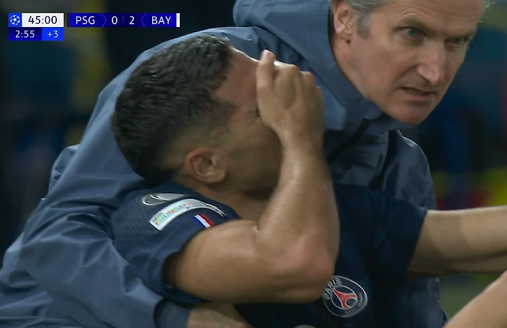 Это была вторая вынужденная замена «ПСЖ» за тайм: до того убрали Усмана Дембеле. Парижане лишились двух ключевых игроков, летели дома 0:2.