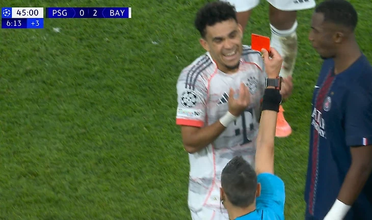 Причем к этому времени Диас уже сделал дубль, «Бавария» вела 2:0 и ждала перерыв. Арбитр Маурицио Мариани добавил три минуты к первому тайму. Две из них прошли, а в начале третьей Хакими ушел на скорости от вингера.