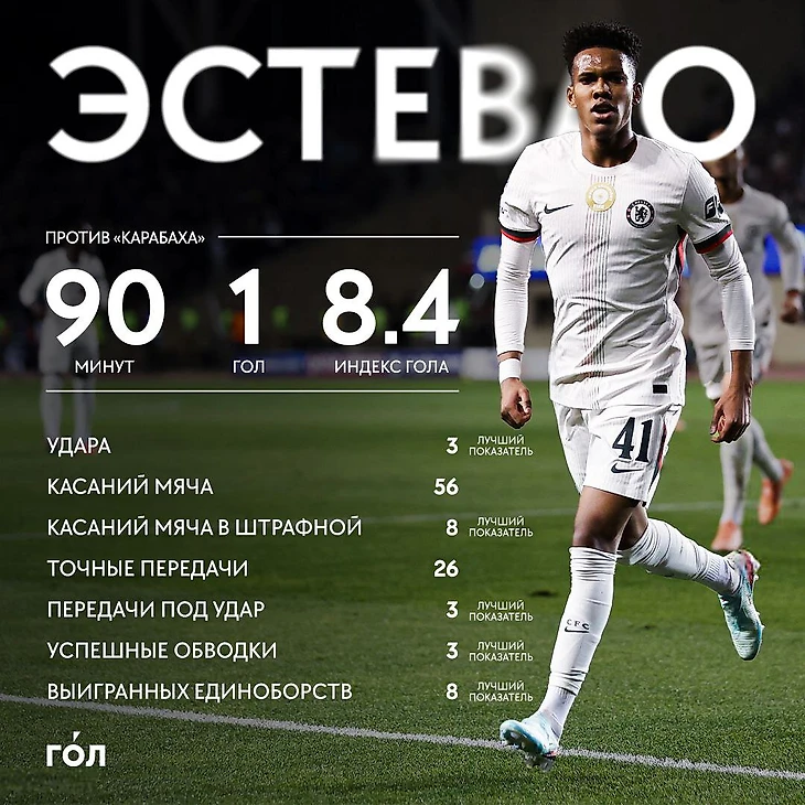 ● Лучший игрок матча по Индексу ГОЛа – Эстевао, заработал 8.4. Эффективнее всех у «Карабаха» был автор гола с игры Андраде – 7.8.