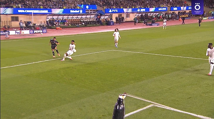«Челси» повел, но интригу прибить не удалось – и «Карабах» воспользовался свободными зонами. На 29-й Камило Дуран продавил 19-летнего защитника «Челси» Джоррела Хато (на скрине), проник в штрафную, но зарядил в штангу. Леандру Андраде идеально сыграл на отскоке – 1:1.