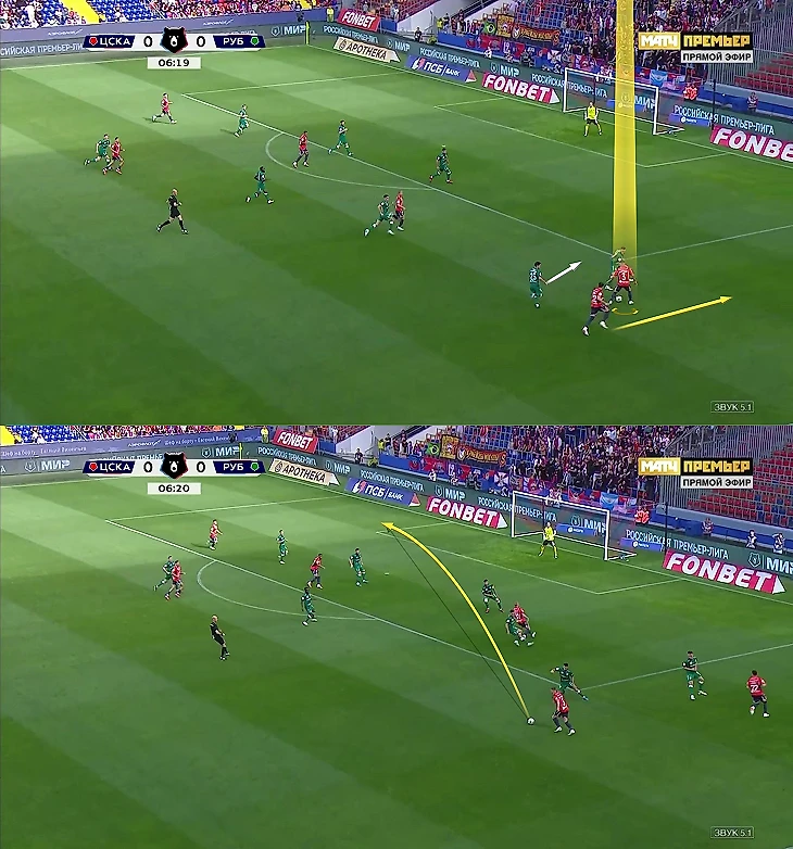 Круговой – единственный вингер ЦСКА, которому удобно заходить в центр из правого фланга ради ударов с левой (Матеус Алвес, Артем Шуманский и Кирилл Глебов – правоногие, левша Энрике Кармо не адаптировался). Если передача приходит слева, Круговой не перекладывает мяч под правую, а оперативно решает левой ногой в одно-два касания.