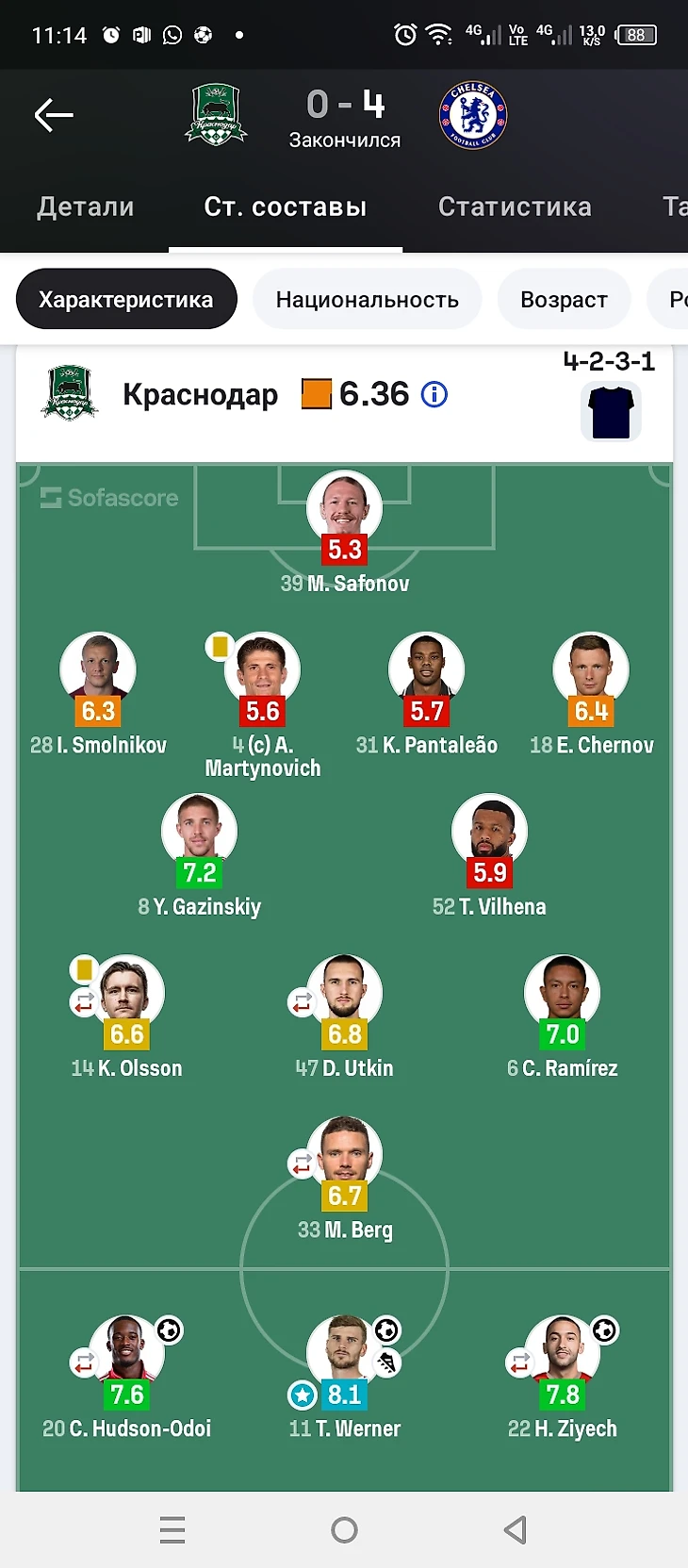 После этого Краснодар стал больше играть в среднем блоке и перешёл на схему 4-4-2, идентичную матчу с Ренном, только вместо Петрова Газинский. В целом игра перешла на равный компонент с неравным преимуществом по владению мячом, количество которого составляло к 30 минуте: 27 на 73 в пользу подопечных Лемпарда. Всё шло слишком волшебно для Краснодара, несмотря даже на этот фактор, но везти не могло вечно. Гол совсем не вытекал из логики игры, но он залетел: судьба была такова, Матвей Сафонов, впечатляющий каждый матч новыми невероятными сэйвами, современными после сложных ударов футболистов, оказался не способен отбить лёгкий удар Хадсона Одои. Позже голкипер скажет: « я виноват, я помог Челси раскрыться». И невозможно не согласиться с этими словами, как может кому-то показаться смешным, это и поспособствовало разгромному поражению в итоге, но ошибки бывают у всех, винить его не стоит. Челси не показал чего-то запредельного в 1 тайме- атаки проходили лишь через правый фланг, и то не всегда.