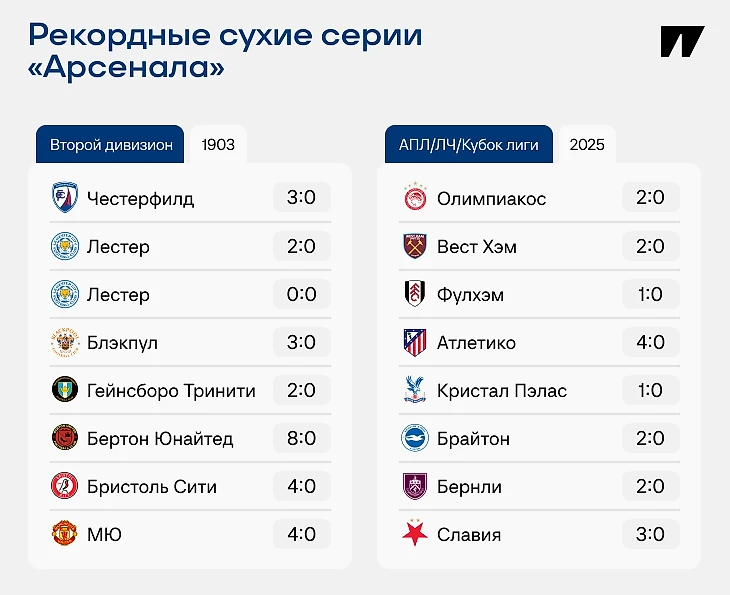 Монструозная оборона «Арсенала» так надежна, что уже взялась за рекорды, установленные на стыке XIX и XX веков. Сейчас впервые в истории восемь побед подряд во всех турнирах без пропущенных голов. Среди команд высшей лиги Англии такое удавалось только «Престону»-1889 и «Ливерпулю»-1920.