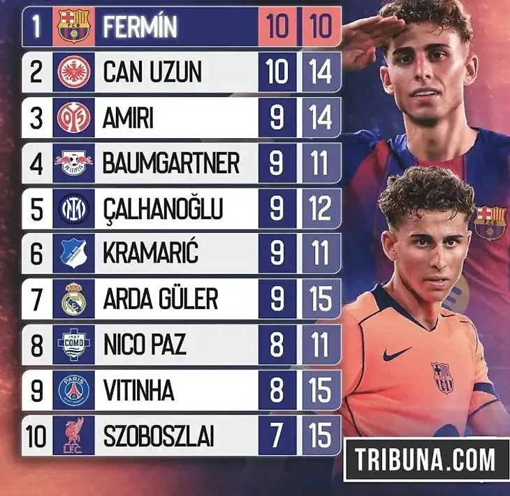 На вершине списка — Фермин Лопес из «Барселоны» с 10 результативными действиями в 10 матчах. За ним идут Кан Узун («Айнтрахт»), Надим Амири («Майнц»), Баумгартнер («Лейпциг») и Крамарич («Хоффенхайм») — у всех по 9–10 очков по системе «гол+пас».
