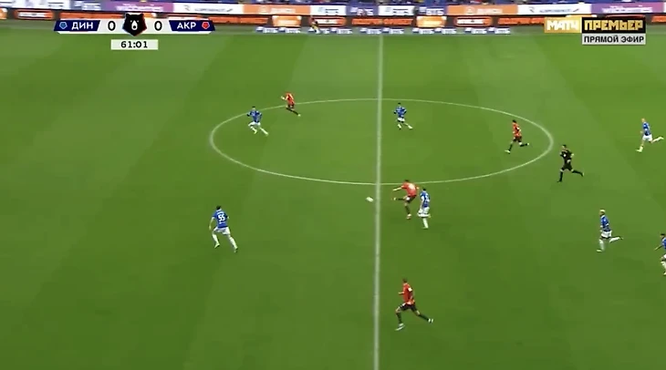 Вовремя выдернулся чуть вперед, чтобы сыграть на перехвате – его действие помогло отнять мяч. Через пару секунд, после рывка, он получил мяч уже у центральной линии. И увидел, исполнил этот пас. Внешней стороной стопы выкрутил на ход Дмитрию Пестрякову.