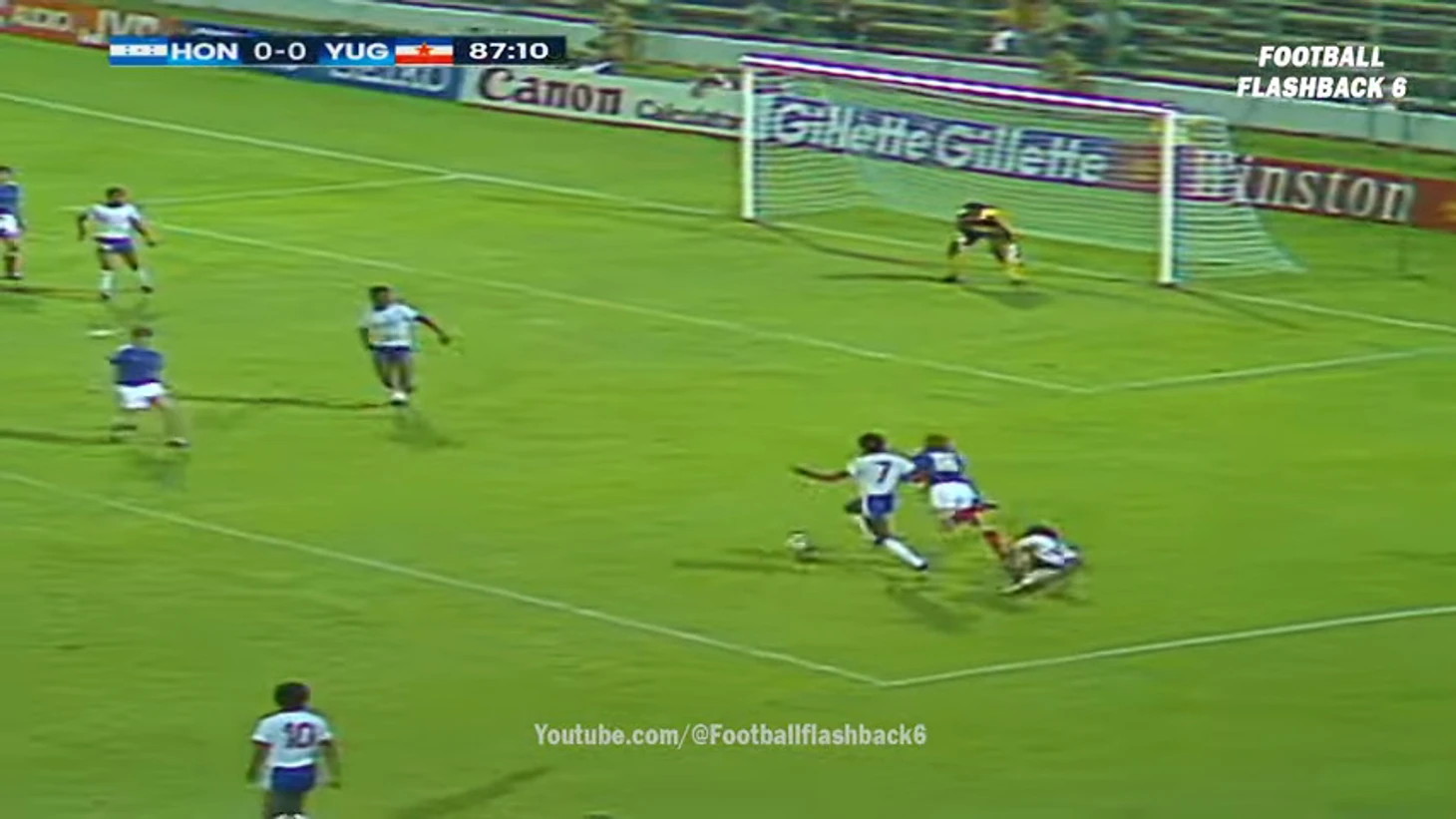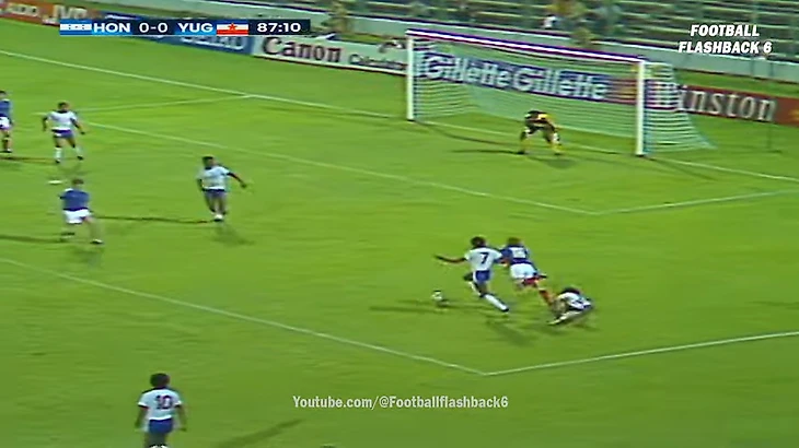 24 июня 1982, Гондурас – Югославия. На 46-й мин Жильберто (№20, в белой футболке) имел момент, подобно которому югославы не могли создать за весь матч. Но, как скажет позже Арзу, «он не был бомбардиром. Он создавал отличные моменты, но не мог их завершить».