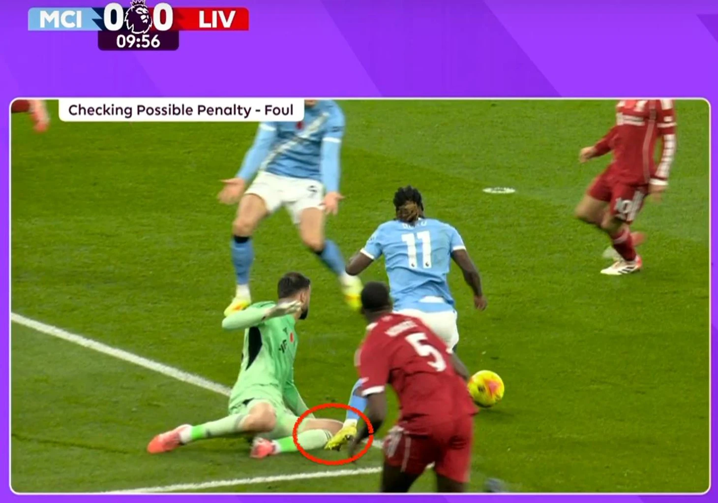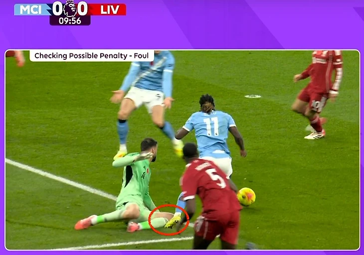 Начался матч весьма предсказуемо: «Сити» завладел инициативой и старался забить быстрый гол. Атаковали «горожане» преимущественно через фланг Конора Брэдли, который в предыдущей игре закрыл Винисиуса. Вот только Жереми Доку об этом рассказать забыли. В прошлой игре против «Ливерпуля» бельгиец мучал Трента Александра-Арнольда, а сегодня не оставил шансов его преемнику. На исходе первой 10-минутки Доку оставил не у дел Брэдли и Конате, вошёл в штрафную и упал после контакта с Мамардашвили. После сеанса ВАР Крис Кавана указал на точку.