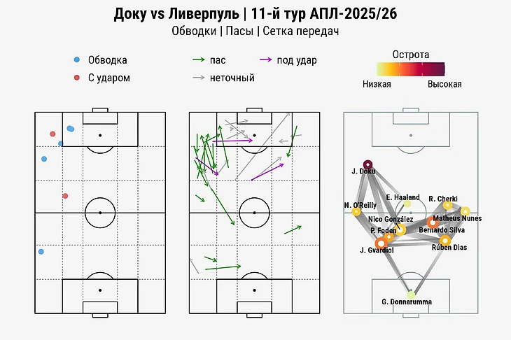 И это все против Коннора Брэдли, который на неделе вообще-то наглухо закрыл Винисиуса и, кажется, набрал неплохую форму. Чтобы понять то, насколько центральной фигурой в игре «Сити» был Доку, достаточно посмотреть на карту передач (ее мы подсмотрели в телегам-канале Соккер-радар)