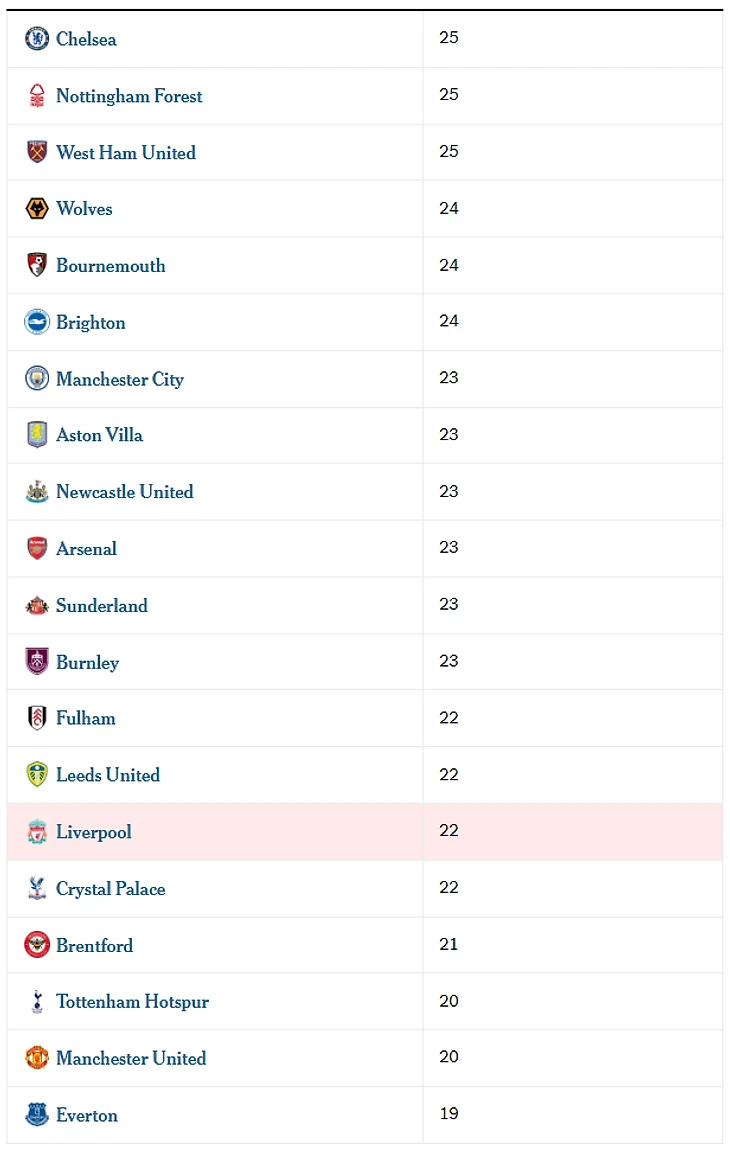 Количество игроков, использовавшиеся каждым клубом Премьер-лиги в сезоне 2025/26