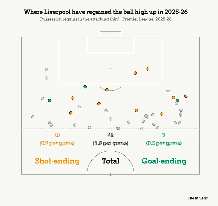 Голы Салаха в ворота «Брентфорда» и «Астон Виллы» были двумя редкими случаями, когда «Ливерпуль» смог добиться потери соперником мяча высоко в поле, что привело к голам в этом сезоне.