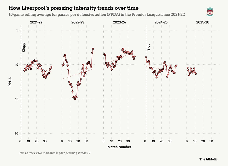 В интенсивности прессинга «Ливерпуля» не было большой разницы — это показано на графике ниже, иллюстрирующем среднее количество передач соперника за 10 игр в расчете на одно оборонительное действие, — но именно влияние оказывается проблематичной.