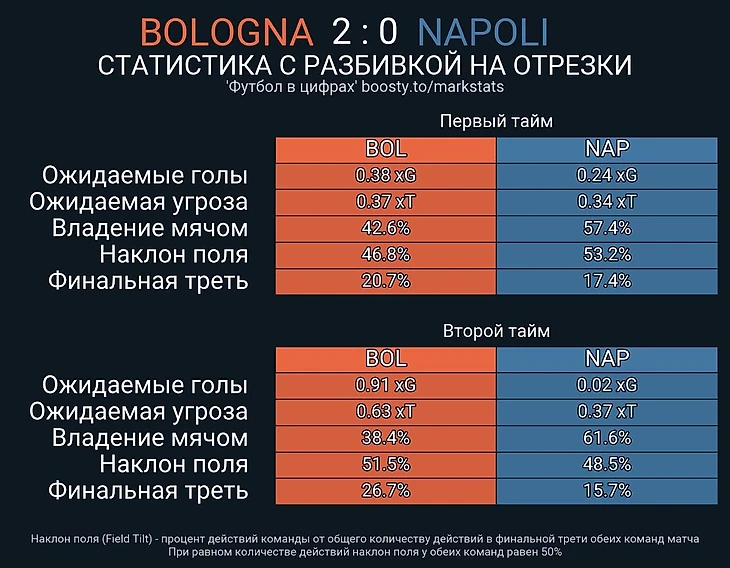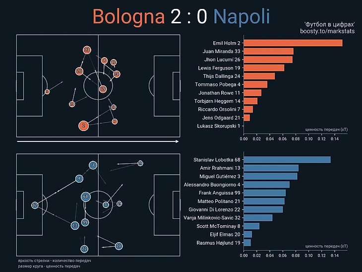 При этом «Наполи» во втором тайме нанёс всего один удар по воротам. Это не просто статистика — это диагноз. xThreat 1.53 против 0.87 чётко показывает, что опасность создавалась почти исключительно «Болоньей», и это при владении меньше 41%.