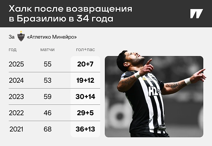 Чемпионат штата – привычный трофей для Халка, его он выигрывает ежегодно. Но и на уровне страны форвард сильно помог: в 2021-м выиграли чемпионат и Кубок Бразилии, в 2022-м – Суперкубок. Для «Атлетико Минейро» та победа в Серии А стала только второй в истории – и первой за 50 лет. И триумф в Кубке тоже стал вторым в истории.