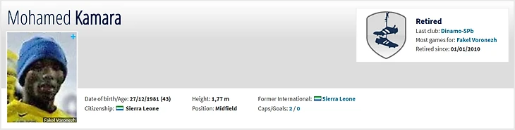 При этом вероятна и опечатка составителей страницы со статистикой футболиста, ведь если они «забили» на ведение информации по карьере игрока, на обновление количества его игр за «Каллон» (везде по нулям), на данные о его путешествии в Россию, а вместо всего этого единственно лишь сфокусировались на его играх за сборную, то вполне можно ожидать просчётов и в других местах, как это, возможно, и случилось с датой рождения. К слову, даже рост Камары от источника к источнику разнится от 174 до 180 сантиметров. Поэтому не забываем о сообщении отечественной прессы, являющимся нашей опорой – игрок «Факела» единственный Мохамед Камара в сборной Сьерра-Леоне тех лет, а значит некоторые неточности можно отставить в сторону.