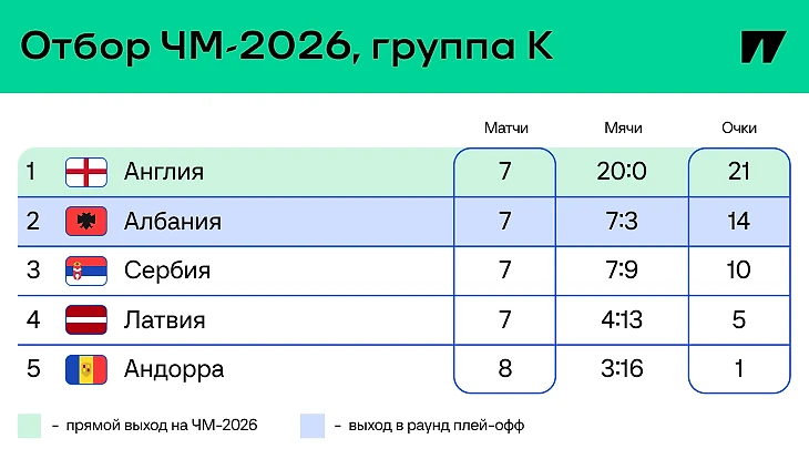 Сербия теперь никак не обойдет Албанию, остается лишь супертеоретический микрошанс в рейтинге Лиги наций. Но им нужно, чтобы Швеция, Румыния и Северная Ирландия зашли в топ-2 своих групп одновременно – и им бы не понадобился путь Лиги наций.