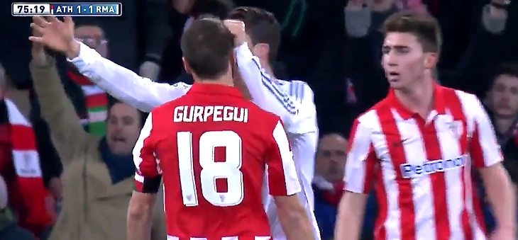 Сезон-2014/15, тяжелый выезд в Бильбао. На 75-й минуте Криштиану показывал, что защитник сыграл рукой, чем вызвал недовольство капитана «Атлетика» Карлоса Гурпеги. Роналду схватил за волосы – и баск уже на земле. Нападающий «Реала» показал, что это симуляция.