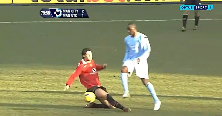 В манчнстерском дерби сезона-2005/06 Роналду продержался чуть больше часа – удалили за опасный подкат под Энди Коула. Криш попытался выйти со своей половины на дриблинге, но упустил мяч – пришлось лететь в подкате. Правда, решение рефери Стива Беннетта очень спорное: португалец прыгал опасно, но по итогу толком не задел Коула.